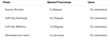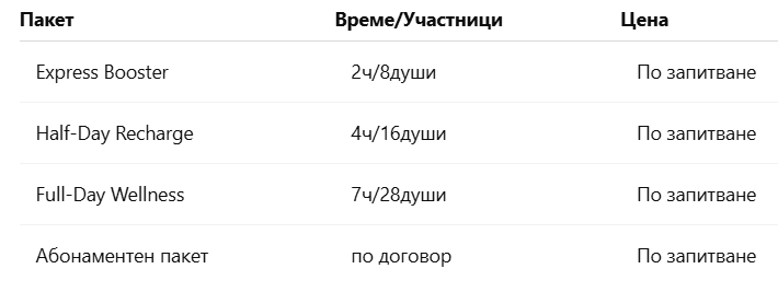 Квалифицирани терапевти с държавно удостоверение и опит в корпоративни среди.