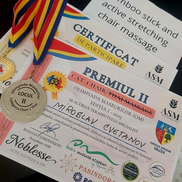 Пътят ми в масажната терапия започна през 2020 г., когато успешно завърших професионален курс и получих държавно удостоверение от МОН. През месец Септември 2025 получих Сребърен медал в категория Масаж на стол, както и 6-то място в категория Спортно-терапевтичен масаж в олимпияда за масажисти организирана от Румънската асоциация на масажистите Asociația Sănătății prin Masaj.
